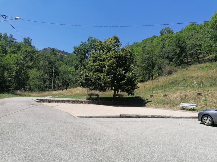 Aire de stationnement pour camping-cars, avec tables de pique-nique ombragées et terrain de pétanque sur place.