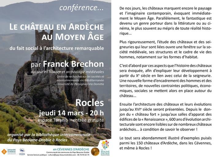 Du fait social à l'architecture remarquable... Le tout sera abondamment illustré d'exemples puisés parmi les 150 châteaux d'Ardèche, dans les Cévennes, et même à Rocles ! Animé par Franck Brechon, docteur en histoire et archéologie médiévale.