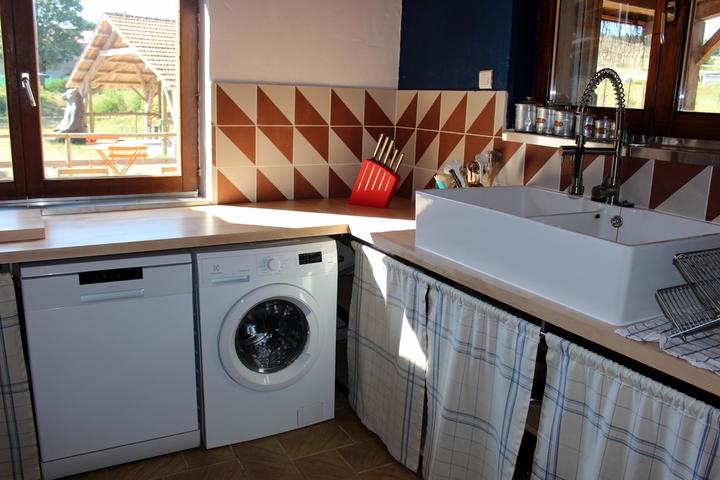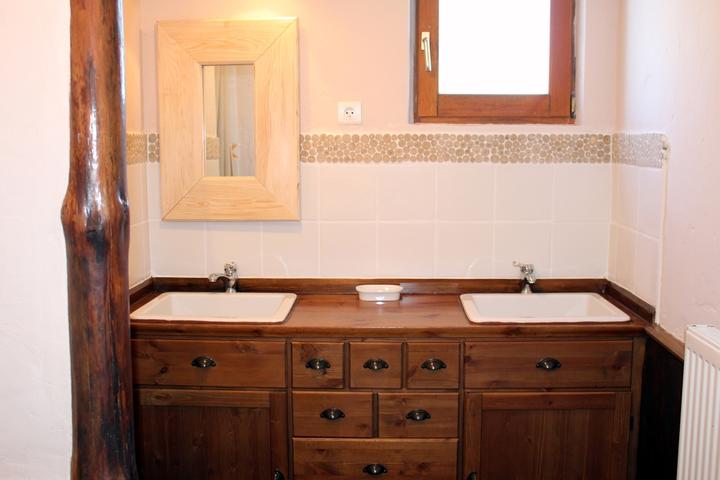 Rez-de-chaussée : Cuisine équipée (piano 5 feux avec four, micro-ondes, lave-vaisselle, lave-linge, réfrigérateur - congélateur, cafetière, bouilloire, mixer, rangements…) / salle à manger / salon avec poêle à bois et TV écran plat. Une salle de douche avec 2 lavabos, 2 douches (sèche-cheveux). Une buanderie avec fer et table à repasser, balais, serpillères, chiffons…). Un WC indépendant.