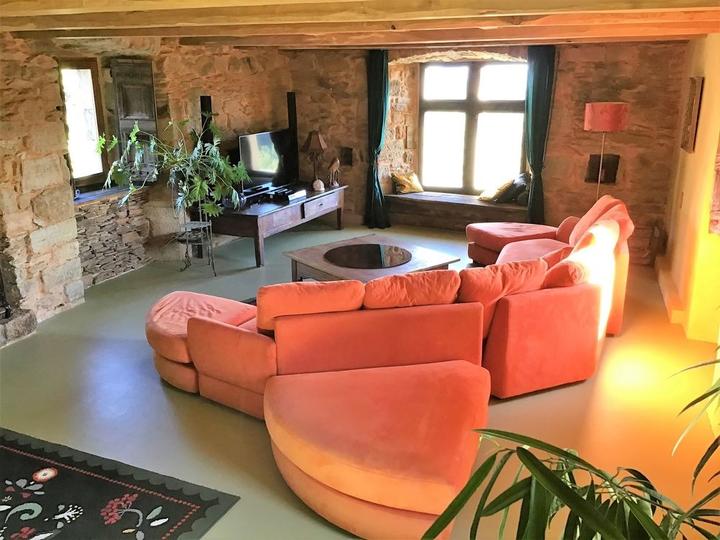 Nous voulions une maison très confortable. Toutes les pièces sont donc très spacieuses, 40 m2 pour la plupart, et lumineuses: pas moins de 26 fenêtres avec, pour beaucoup, des vues panoramiques magnifiques sur Faugères et la campagne environnante. Chaque fenêtre est un tableau!