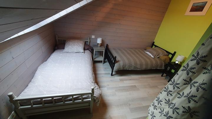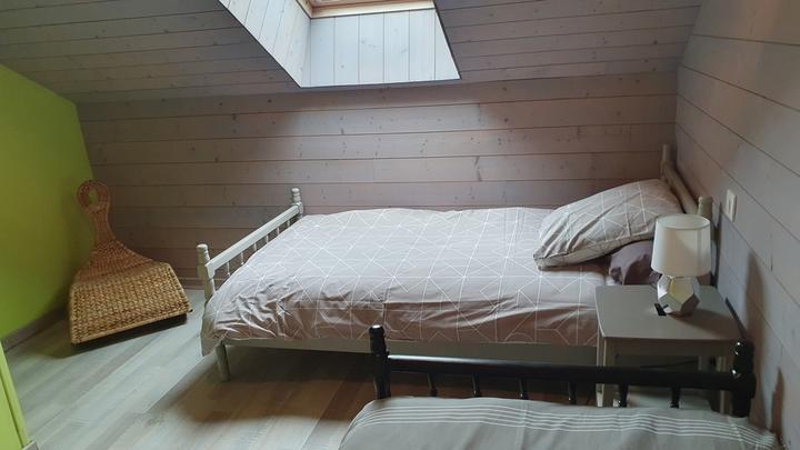 - A l'étage (accès par escalier) : 1 ch. avec 1 lit "QUEEN SIZE" 2 pers. (160 x 200) et 1 ch. avec 2 lits 1 pers. (90 x 190). Draps fournis pour tous les lits (gratuit).