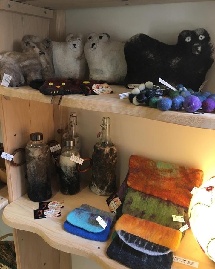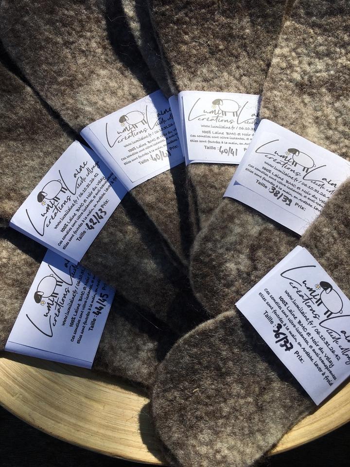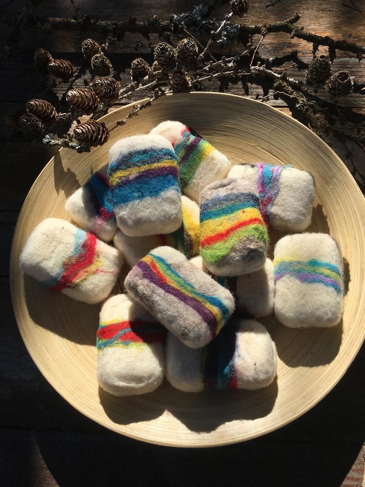 La laine teinte que j'utilise provient de Filatures comme Terrade (Creuse), Catusse (Aveyron) ou encore Wollknoll (Allemagne). Le savon qui me sert à feutrer est du savon de Marseille bio.